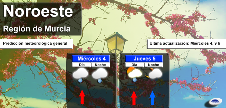 Mañana jueves, 5 de febrero, las nubes se alternarán con el sol por el Noroeste de Murcia. A ratos serán más abundantes, con cielo nuboso, y dejando algún chubasco puntual. Atención al viento del oeste muy fuerte, con rachas de 80 a 90 Km/h, especialmente durante la mañana, horas centrales y la tarde. Temperaturas, tanto máximas como mínimas, en ascenso.