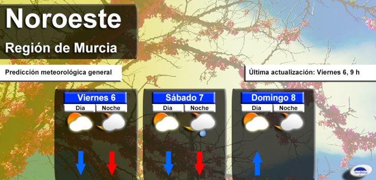 A lo largo del fin de semana, atmósfera inestable por el Noroeste de Murcia. Tanto sábado como domingo, las nubes se alternarán con el sol. A ratos serán más abundantes, con cielo nuboso y dejando algún chubasco puntual. Sería de nieve por encima de 1500 m. Atención al viento del oeste, con rachas de 60 a 70 Km/h. Temperaturas, tanto máximas como mínimas, en descenso.