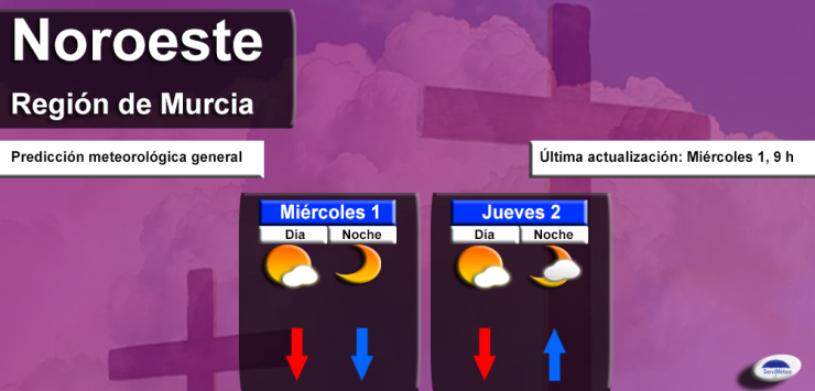 Mañana, Jueves Santo, 2 de abril, se espera sol por el Noroeste de Murcia, con cielo poco nuboso. Tan solo a ratos se verán intervalos de nubes altas. Viento del norte, de flojo a moderado. Temperaturas, tanto máximas como mínimas, en descenso ligero. En los próximos días, Viernes Santo, Sábado Santo y Domingo de Resurrección, se
