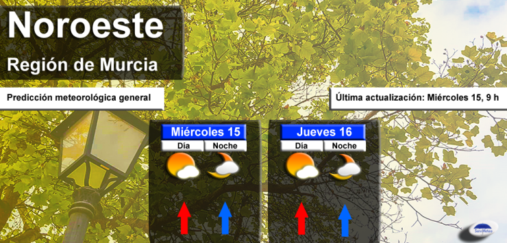 Mañana jueves, 16 de abril, se espera sol por el Noroeste de Murcia, con cielo poco nuboso. Por la tarde, a ratos, se verán intervalos de nubes medias. Viento en régimen de brisas, flojo o en calma. Temperaturas, tanto máximas como mínimas, en ascenso ligero.
