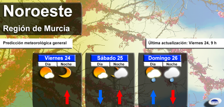 A lo largo del fin de semana, la atmósfera tenderá a inestabilizarse por el Noroeste de Murcia. Mañana sábado se espera sol, con cielo poco nuboso. No obstante, las nubes aumentarán de cara al domingo, dejando algún chubasco hacia la tarde y noche. Viento variable, flojo. Temperaturas en ascenso ligero mañana sábado, y en descenso notable el domingo.