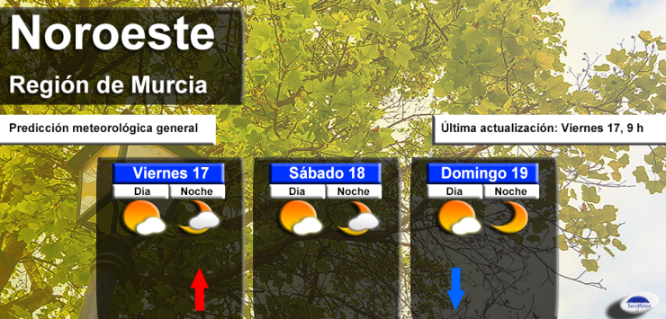 De cara al fin de semana, tiempo estable por el Noroeste de Murcia. Tanto sábado como domingo, se espera sol, con cielo poco nuboso. Tan solo, a ratos, se verán intervalos de nubes medias hacia la tarde. Viento en régimen de brisas, flojo o en calma. Temperaturas, tanto máximas como mínimas, sin cambios importantes.