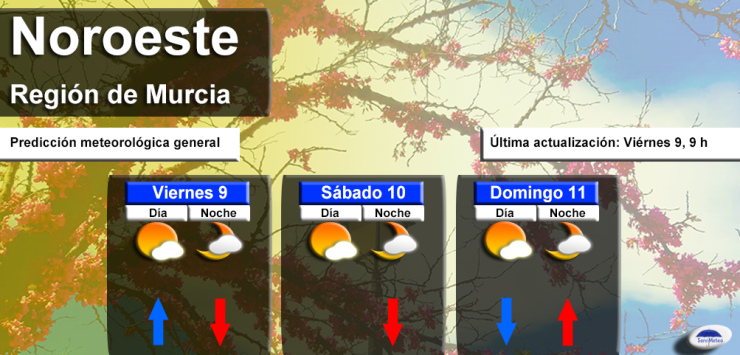 A lo largo del fin de semana, atmósfera estable por el Noroeste de Murcia. Tanto sábado como domingo se espera sol, con cielo poco nuboso. Tan solo a ratos se verán intervalos de nubes altas. Viento del oeste, de flojo a moderado. Temperaturas, tanto máximas como mínimas, en descenso.