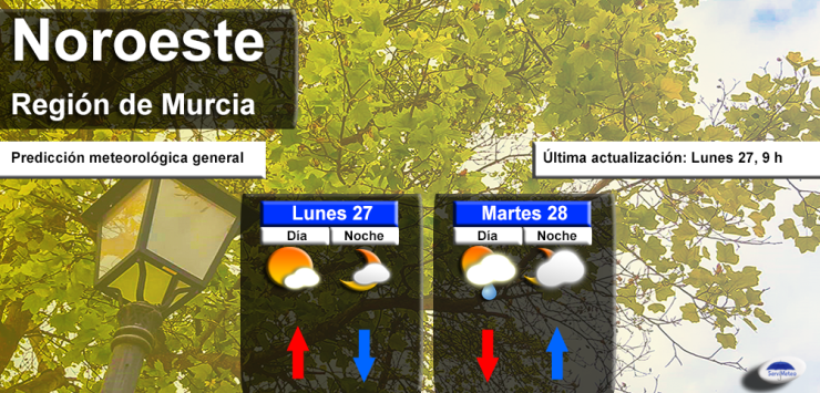 Mañana martes, 28 de abril, las nubes se alternarán con el sol por el Noroeste de Murcia. A ratos serán más abundantes, con cielo nuboso. Dejarán algunos chubascos, más probables en las horas centrales y la tarde, sin descartar que vengan con tormenta. Viento en régimen de brisas, flojo. Temperaturas mínimas en ascenso ligero. Máximas en descenso ligero por la tarde.