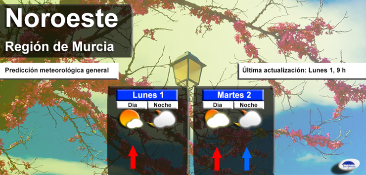 Mañana martes, 2 de diciembre, las nubes se alternarán con el sol por el Noroeste de Murcia. A ratos serán más abundantes, con cielo nuboso, dejando algún chubasco puntual en sierras de Moratalla. Viento variable, flojo. Temperaturas, tanto máximas como mínimas, en ascenso ligero.