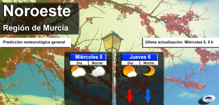 Mañana jueves, 6 de noviembre, se espera sol por el Noroeste de Murcia, con cielo poco nuboso. Tan solo a ratos se verán intervalos de nubes altas. Viento del noroeste, de moderado a fuerte. Temperaturas en descenso, notándose más en los valores diurnos.