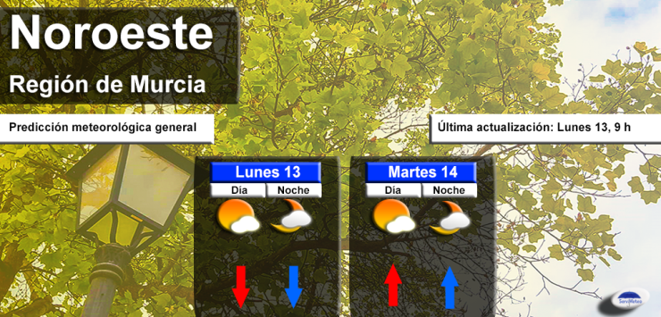 Mañana martes, 14 de abril, se espera sol por el Noroeste de Murcia, con cielo poco nuboso. Por la tarde, a ratos, se verán intervalos de nubes medias. Viento del norte, de flojo a moderado. Temperaturas, tanto máximas como mínimas, en ascenso ligero.