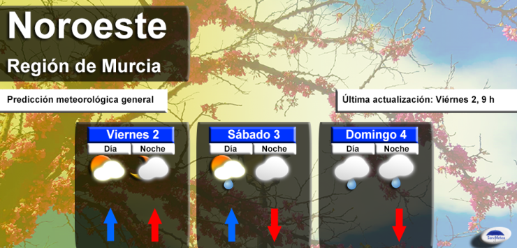 En este primer fin de semana de 2026, la atmósfera se mostrará inestable por el Noroeste de Murcia. Tanto sábado como domingo las nubes serán muy abundantes, con cielo de nuboso a cubierto. Tan solo el sábado por la mañana, a ratos se verá el sol y se espera algún chubasco puntual por la tarde. Hacia el domingo, lluvia, especialmente por la tarde y noche. Viento variable, flojo o en calma. Temperaturas en descenso.